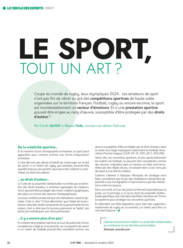 Cécile Guyot et Manon Tual ont eu le plaisir de publier dans l’IJ un article sur la thématique du sport, possible oeuvre d’art?