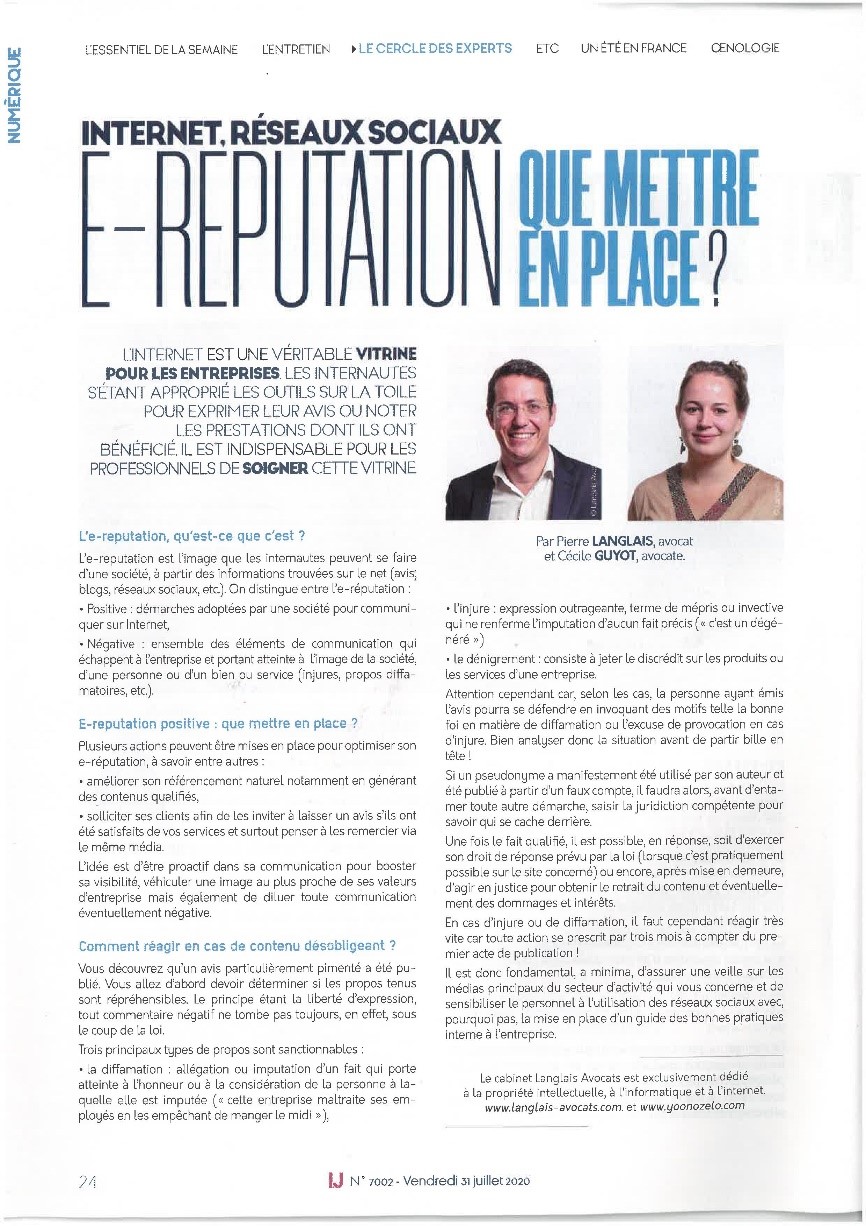 Cécile GUYOT et Pierre LANGLAIS ont publié un article sur l’e-réputation dans l’Informateur Judiciaire du 31 juillet 2020.
