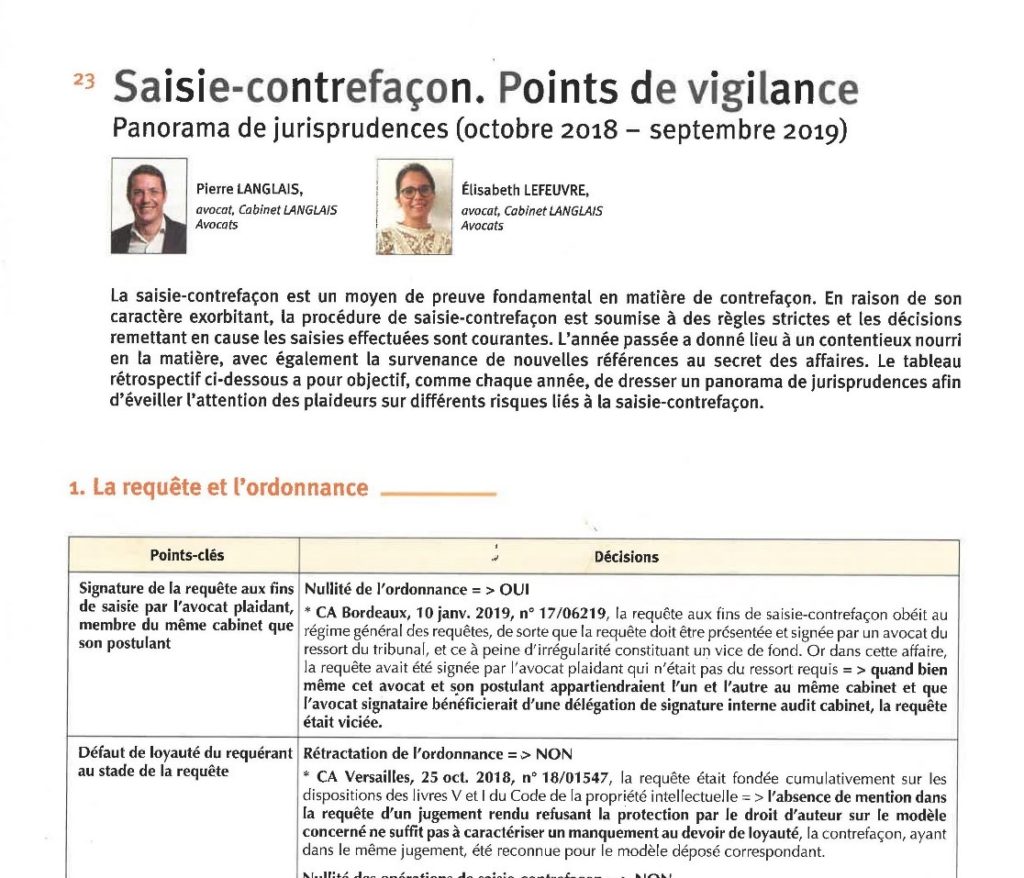 Elisabeth Lefeuvre et Pierre Langlais vous présentent le panorama des jurisprudences recensées sur une année [octobre 2018-septembre 2019] concernant la saisie contrefaçon [LexisNexis de novembre 2019].
