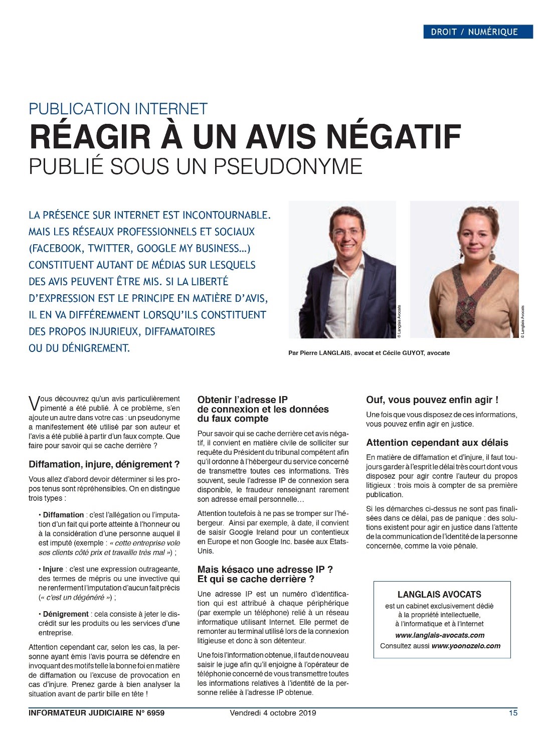 Cécile Guyot et Pierre Langlais ont publié un article dans l’Informateur Judiciaire du 4 octobre 2019.