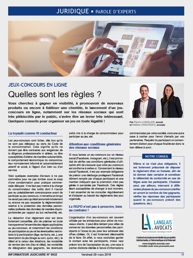 Pierre LANGLAIS et Hélène CHAUVEAU ont publié un article dans dans l’Informateur Judiciaire du 29 mars 2019 sur les jeux-concours en ligne :