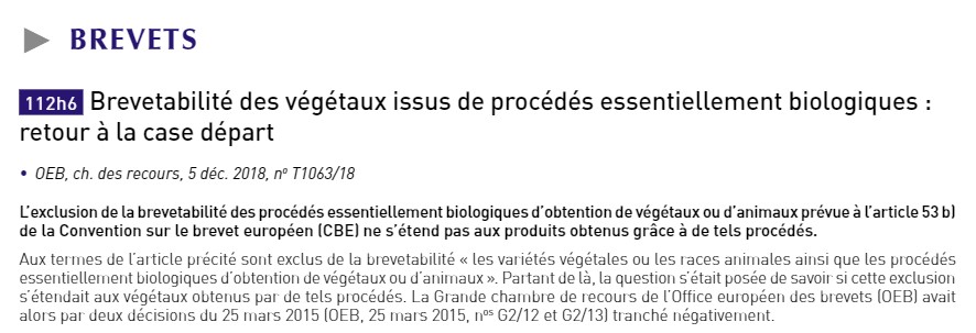 Brevetabilité des végétaux issus de procédés essentiellement biologiques : retour à la case départ – Revue Lextenso, l’essentiel de la PI (mai 2019)